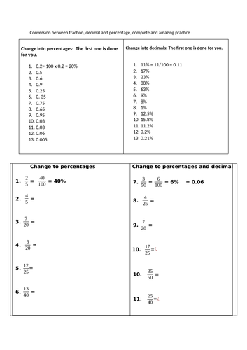 Conversion Between Fraction Decimal And Percentage With Answers Differentiated Resource Teaching Resources