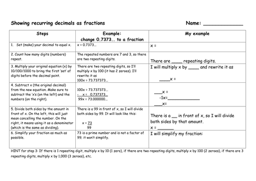 Recurring Decimals As Fractions Scaffold Sheet Teaching Resources